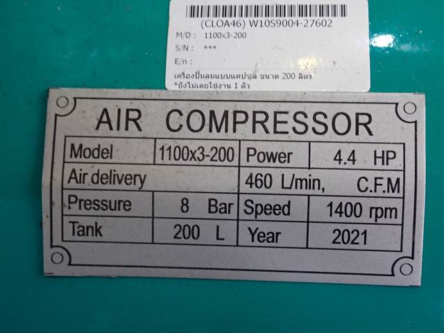 เครื่องปั๊มลมแบบแคปซูล ขนาด 200 ลิตร 4.4 แรงม้า *ยังไม่เคยใช้งาน 1 ตัว