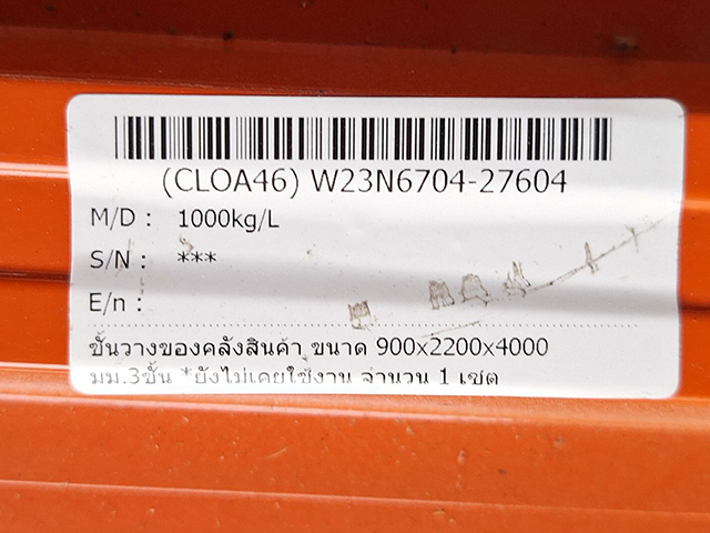 ชั้นวางของคลังสินค้า ขนาด 900x2200x4000 มม.3 ชั้น *ยังไม่เคยใช้งาน จำนวน 1 ชุด